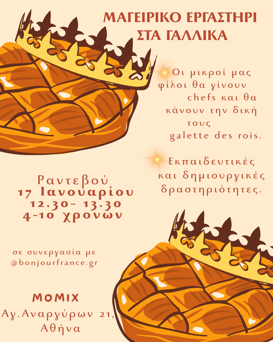Εργαστήρι μαγειρικής στα Γαλλικά. Οι μικροί μας φίλοι θα φτιάξουν ο καθένας τους την παραδοσιακή Γαλλική βασιλόπιτα μαθαίνοντας τα υλικά της συνταγής την οποία θα πάρουν μαζί τους! Θα μάθουμε τα έθιμα της Γαλλίας και θα δούμε ποιος θα γίνει ο βασιλιάς για τη νέα χρονιά!! Ελάτε να ανακαλύψετε το λεξιλόγιο των chef μέσω εκπαιδευτικών παιχνιδιών.