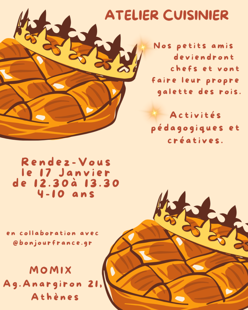 Εργαστήρι μαγειρικής στα Γαλλικά. Οι μικροί μας φίλοι θα φτιάξουν ο καθένας τους την παραδοσιακή Γαλλική βασιλόπιτα μαθαίνοντας τα υλικά της συνταγής την οποία θα πάρουν μαζί τους! Θα μάθουμε τα έθιμα της Γαλλίας και θα δούμε ποιος θα γίνει ο βασιλιάς για τη νέα χρονιά!! Ελάτε να ανακαλύψετε το λεξιλόγιο των chef μέσω εκπαιδευτικών παιχνιδιών.