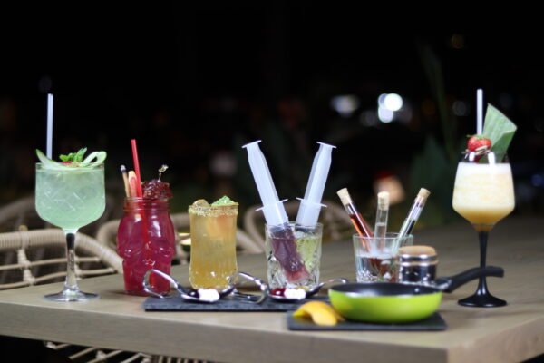 Athens Nightfall: Γλυκόξινο Cocktail με παλαιωμένο ρούμι και Metaxa 7 αστέρων και εξωτικές γεύσεις φρούτων, χειροποίητο σιρόπι πιπερόριζας και νότες μπαχαρικών. Σερβίρεται με δοκιμαστικό σωλήνα με γεύση φρούτα του πάθους, Vodka και ‘‘πέρλες’’ μύρτιλο